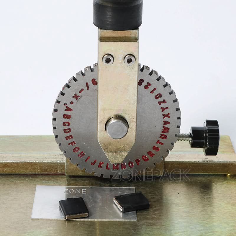 The ZONESUN ZS-JTK508 Manual Metal Stamping Machine is designed for debossing and embossing on metal surfaces such as dog tags, nameplates, and bracelets. It supports multiple letter sizes and prints uppercase letters, numbers, and basic symbols. Ideal for marking model numbers, dates, batch codes, and serial numbers. The hand-press mechanism uses interchangeable steel wheels, simplifying character changes and improving efficiency for small-scale metal marking tasks.