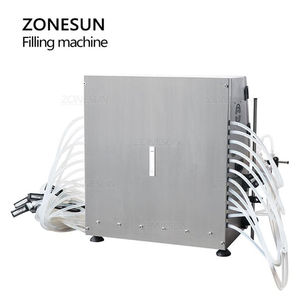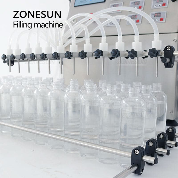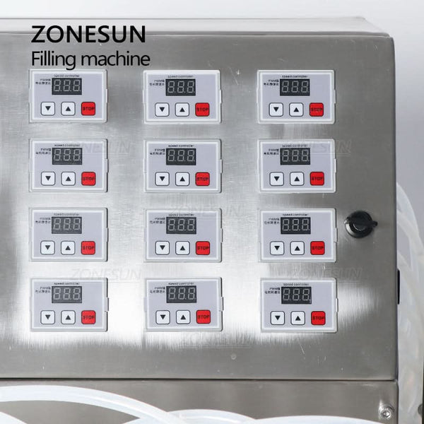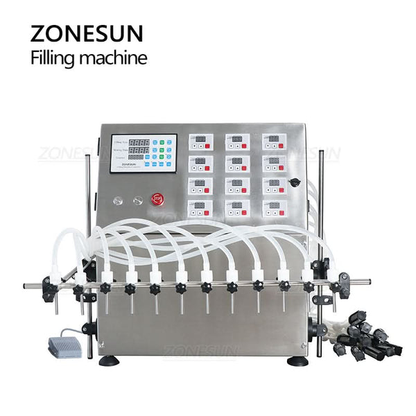 The ZONESUN ZS-DPYT12P semi-automatic filling machine features 12 independently controlled nozzles for efficient multi-bottle filling. Designed for low-viscosity liquids such as juice, milk, water, and perfume, its diaphragm pump delivers consistent accuracy across a wide filling range. Compact yet powerful, it's ideal for cosmetics, beverages, and chemical applications, streamlining production in limited workspace settings.
