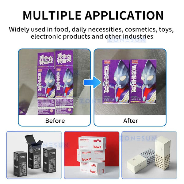 The ZONESUN ZS-FHJ300B is a fully automatic box folding and sealing machine designed to streamline carton packaging. It features a front clamping belt that transports pre-loaded boxes into the gluing station, where hot melt adhesive is applied to the top and bottom flaps. The machine then folds and seals the flaps securely, ensuring a clean and professional finish.
