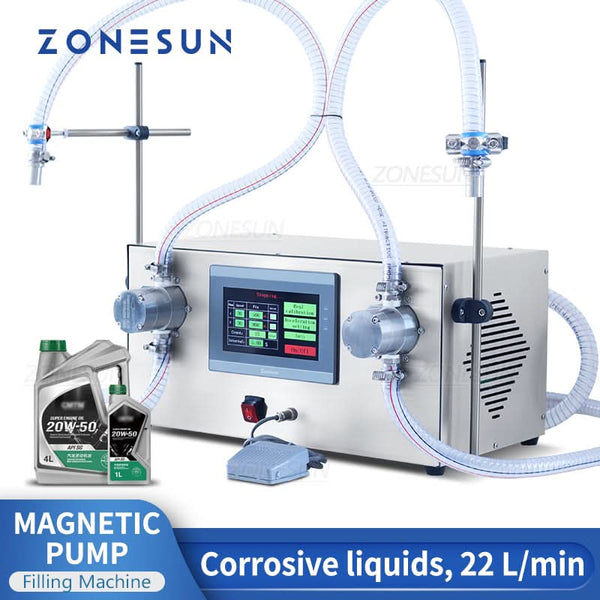 The ZS-G25A2 is a dual-head liquid filling machine equipped with two high-performance 316L stainless steel magnetic pumps, making it ideal for filling corrosive and high-temperature liquids. Designed for high-volume container applications, it offers a maximum flow rate of 22L/min and supports flexible nozzle options. Built for durability and precision, this compact unit is perfect for chemical, cosmetic, and industrial fluid packaging operations.