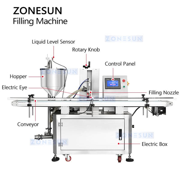 The ZS-VTRP1D is a high-efficiency automatic filling machine designed for thick liquids and pastes. Featuring a reliable rotor pump system, it ensures precise and consistent filling, making it ideal for products like peanut butter, chili sauce, creams, and more. Its user-friendly interface allows easy volume adjustments, streamlining production with minimal downtime. Widely used across food, cosmetics, and daily chemical industries, this machine combines robust performance with simple operation—perfect for scaling up manufacturing lines.