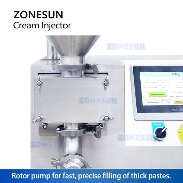 Equipped with a rotor pump for fast, precise filling of thick pastes, ideal for chocolate sauce, cream, and jam.