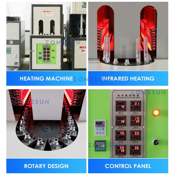 - Full-time stabilized heating system. Heating temperature and speed are adjustable according to sizes and features of preforms.