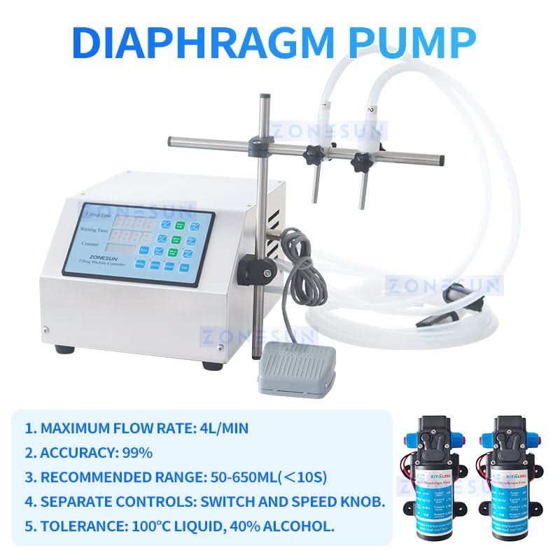 The ZS-DPYT2P is a semi-automatic digital liquid filling machine designed for precise and efficient filling of beverages, water, perfume, and other low-viscosity liquids. Ideal for use in pharmaceutical, food, and daily chemical industries, it features dual pumps for enhanced flow control and adjustable volume settings. Its compact design makes it suitable for tabletop operations, while the digital interface ensures easy calibration and repeatable accuracy. Note: not recommended for foamy liquids.