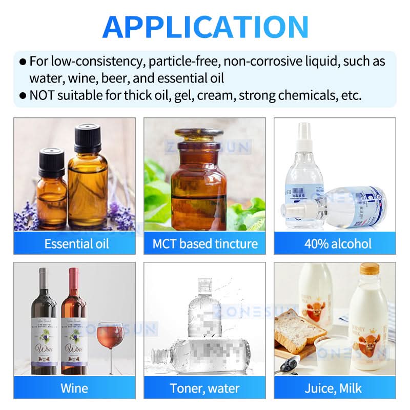 Suitable for Beverages, wine, vinegar, soy sauce,essence of liquid skin care products, perfume and other liquid products. NOT suitable for corrosive liquids and highly viscous liquids and the liquid thicker than edible oil.Especially suitable for small batch production in medicine, chemical, food, beverage, oil, cosmetics and other industries.