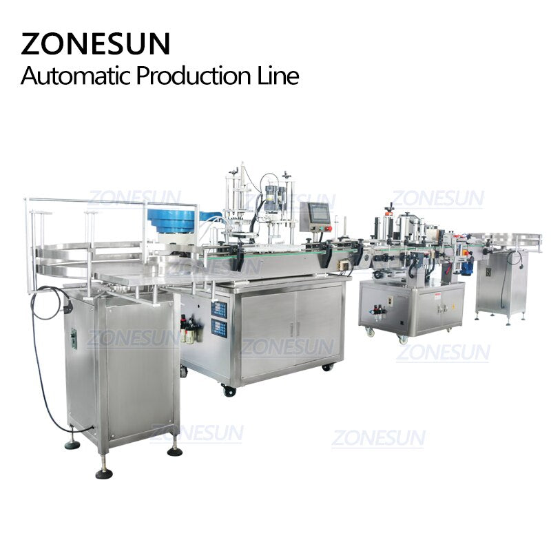 The ZONESUN ZS-FAL180A8 is a high-efficiency automatic production line designed for filling, capping, and labeling round bottles. Ideal for low-viscosity liquids like perfume, juice, and cosmetics, it integrates unscrambling, magnetic pump filling, precision capping, and single or double-sided labeling. With PLC control and customizable configuration, this line is perfect for pharmaceutical, chemical, and personal care manufacturing.