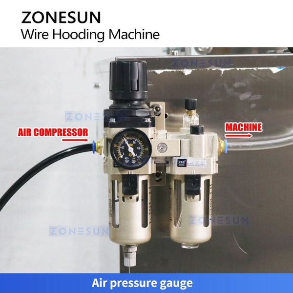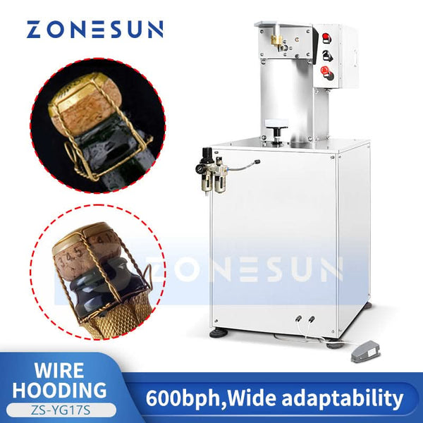 The ZONESUN ZS-YG17S is a semi-automatic wire hooding machine designed for efficiently sealing wire hoods onto wooden corks of wine and other bottled beverages. This user-friendly machine offers a reliable and safe method for securing corks, saving time and labor compared to manual methods. Its compact and lightweight design makes it suitable for various settings, from small-scale operations to larger production lines.