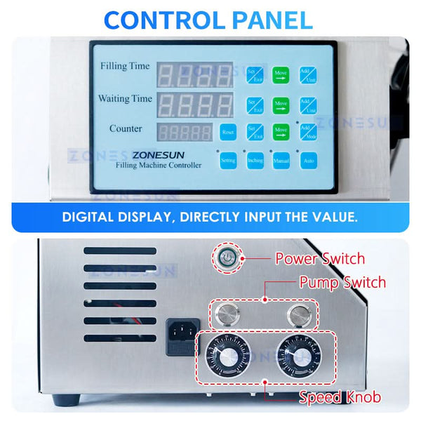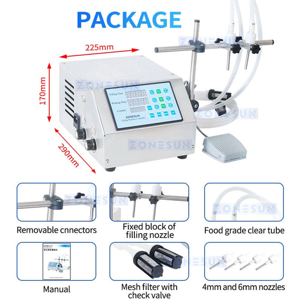 The ZS-DPYT2P is a semi-automatic digital liquid filling machine designed for precise and efficient filling of beverages, water, perfume, and other low-viscosity liquids. Ideal for use in pharmaceutical, food, and daily chemical industries, it features dual pumps for enhanced flow control and adjustable volume settings. Its compact design makes it suitable for tabletop operations, while the digital interface ensures easy calibration and repeatable accuracy. Note: not recommended for foamy liquids.