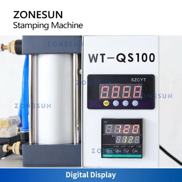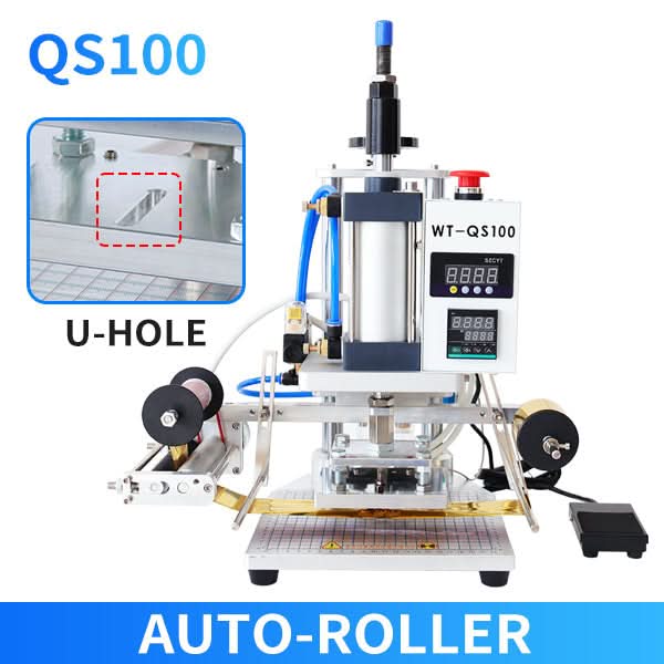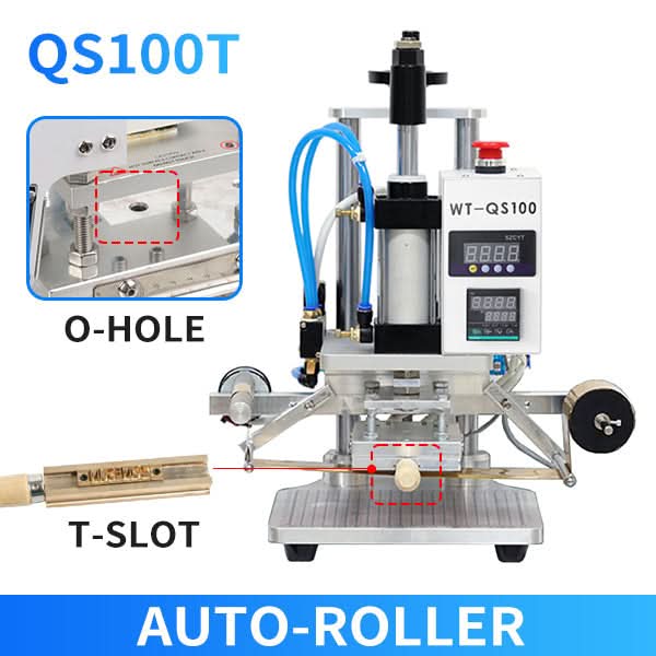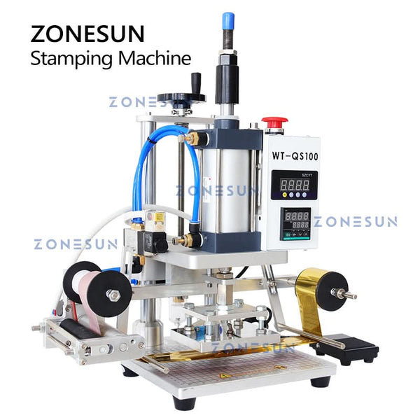 The ZONESUN ZS-QS100 series is a pneumatic hot stamping machine designed for precise branding, embossing, and bronzing on leather, paper, wood, PVC, and more. With adjustable temperature and stamping time, it delivers professional results across a wide range of materials. Ideal for customizing leather goods, packaging, and crafts, this machine supports multiple plate sizes and includes models with auto-rollers, T-slots, and movable bases for enhanced flexibility. An air compressor is required for operation.